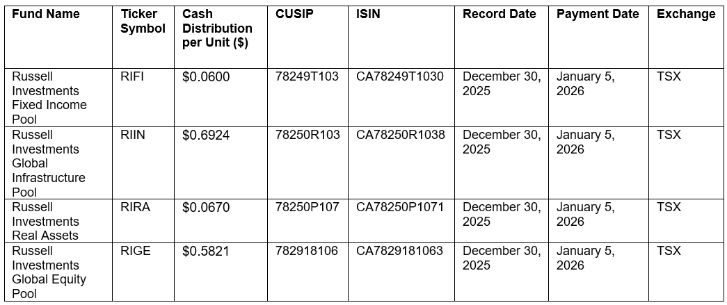 TORONTO, December 18, 2025 – Russell Investments Canada Limited (“Russell Investments Canada”) today announced cash distributions for the ETF Series of certain mutual funds (“ETF Series”) for the month of December. Unitholders of record of the ETF Series, as of the Record Date, will receive a per-unit cash distribution payable on the Payment Date.