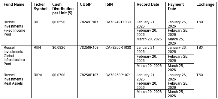 TORONTO, January 13, 2026 – Russell Investments Canada Limited (“Russell Investments Canada”) today announced cash distributions for the ETF Series of certain mutual funds (“ETF Series”) for the months of January, February, and March. Unitholders of record of the ETF Series, as of the Record Date, will receive a per-unit cash distribution payable on the Payment Date