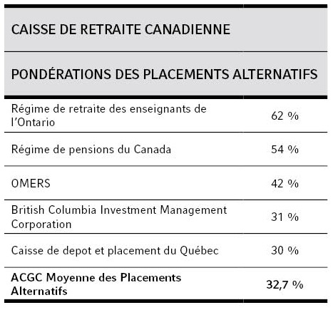 Comme l’illustre le tableau suivant, en moyenne, les caisses de retraite canadiennes consacrent 32,7 % de leur actif total aux placements alternatifs.1