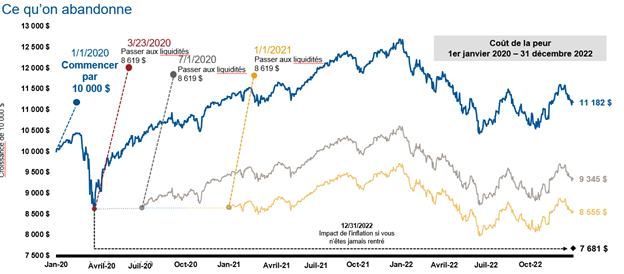 Examinons le graphique ci-dessous. Il montre à quel point il est important de rester investi contre vents et marées. Les investisseurs qui ont fui le marché lorsque la pandémie de COVID-19 a commencé à se propager en mars 2020 ont eu de la difficulté à trouver un nouveau point d’entrée au cours de l’année suivante, les actions ayant rebondi rapidement. À la fin de 2022, ceux qui étaient restés investis lors des hausses et des baisses du marché étaient en avance sur les investisseurs qui avaient initialement succombé à la peur, mais qui sont finalement revenus sur le marché. Qu’en est-il de ceux qui se sont retirés lorsque la pandémie est apparue et qui ne sont jamais revenus? Eh bien, la valeur réelle de leur investissement initial a été réduite par le coût croissant de l’inflation en 2022.