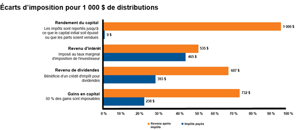 Tous les exemples présentés sont basés sur les taux marginaux d’imposition suivants de l’Ontario pour 2023 aux fins du calcul des impôts à payer : revenus d’intérêts = 46,4 %, Dividendes canadiens admissibles = 29,5 % et