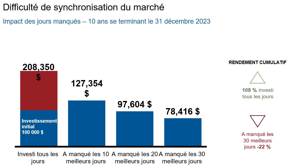 Source: Morningstar. Rendements basés sur l’indice S&P 500 pour la période de 10 ans se terminant le 31 décembre 2023. Cet exemple hypothétique n’est donné qu’à titre d’illustration et ne vise pas à refléter le rendement d’un placement réel. Les investissements n’évoluent généralement pas à un taux de rendement uniforme et peuvent connaître une croissance négative. Les rendements des indices sont des rendements passés qui ne sont pas garants des rendements futurs, et qui ne sont pas représentatifs d’un placement précis. Les indices ne sont pas gérés et il est impossible d’investir directement dans ces derniers.