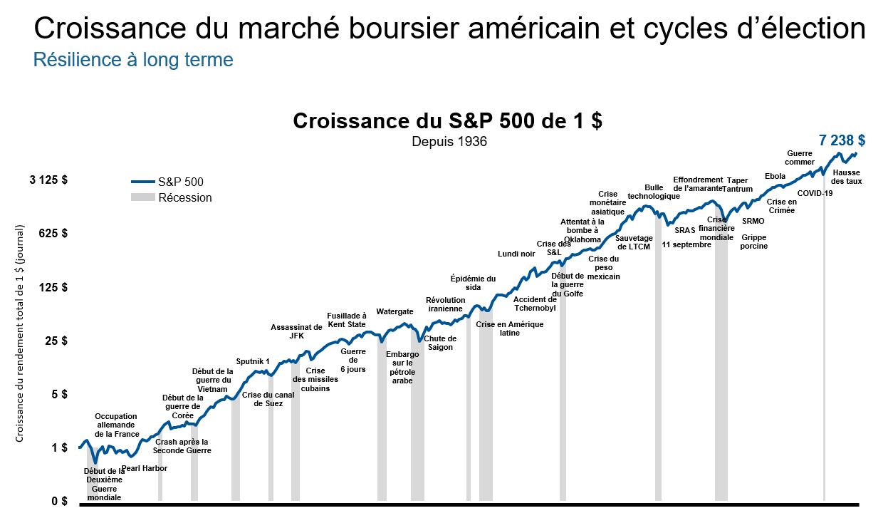 Le graphique ci-dessous illustre l’évolution de l’indice S&P 500 dans le temps, mettant en évidence l’importance de rester investi. Bien qu’il y ait eu de nombreux obstacles en chemin, la tendance à long terme montre une progression. Retirer votre ligne de l’eau et rentrer chez vous simplement parce qu’il pleut pourrait vous faire manquer la plus grosse prise. C’est comme si vous commenciez à rentrer chez vous et que vous entendiez les pêcheurs des autres bateaux s’exclamer parce que le poisson a commencé à mordre. Vous pourriez faire demi-tour et vous réinstaller, mais vous risqueriez d’être en retard par rapport aux autres.