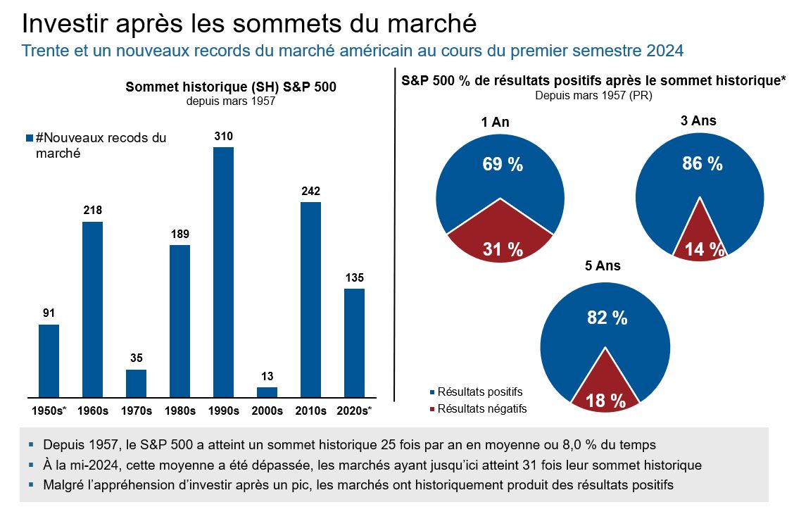Source: Morningstar. Indice des prix S&P 500 au 30/6/2024. *1950 : du 4/3/1957 au 31/12/1959, *2020 : du 01/01/2020 au 30/06/2024. ATH; sommet historique. Les rendements des indices sont des rendements passés qui ne sont pas garants des rendements futurs et qui ne sont pas représentatifs d’un placement précis. Les indices ne sont pas gérés et il est impossible d’investir directement dans ces derniers.