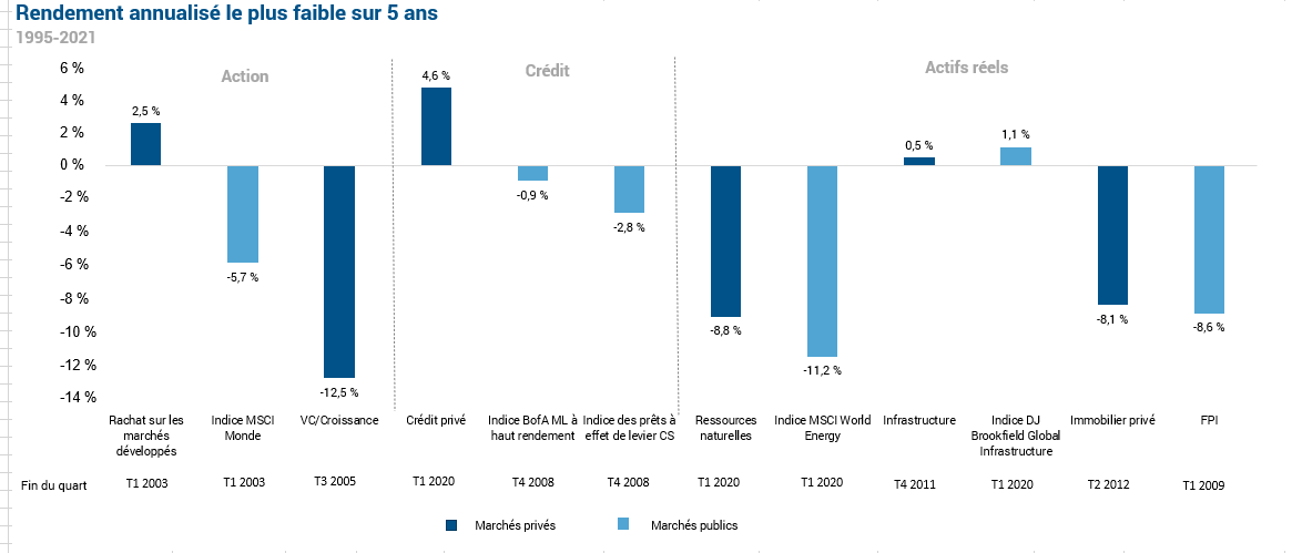 Lors de la gestion du risque total du portefeuille, il est primordial d’éviter les baisses importantes, car les rendements négatifs ont un impact significatif sur l’effet positif que la capitalisation a sur les rendements au fil du temps. La pièce 3 ci-dessous7 souligne qu’au cours de leur pire période de cinq ans, les rachats sur les marchés développés, le crédit privé et les infrastructures privées ont tous généré des rendements positifs. La principale leçon à retenir : les marchés privés ont généralement connu des baisses plus faibles par rapport à leurs homologues des marchés publics.