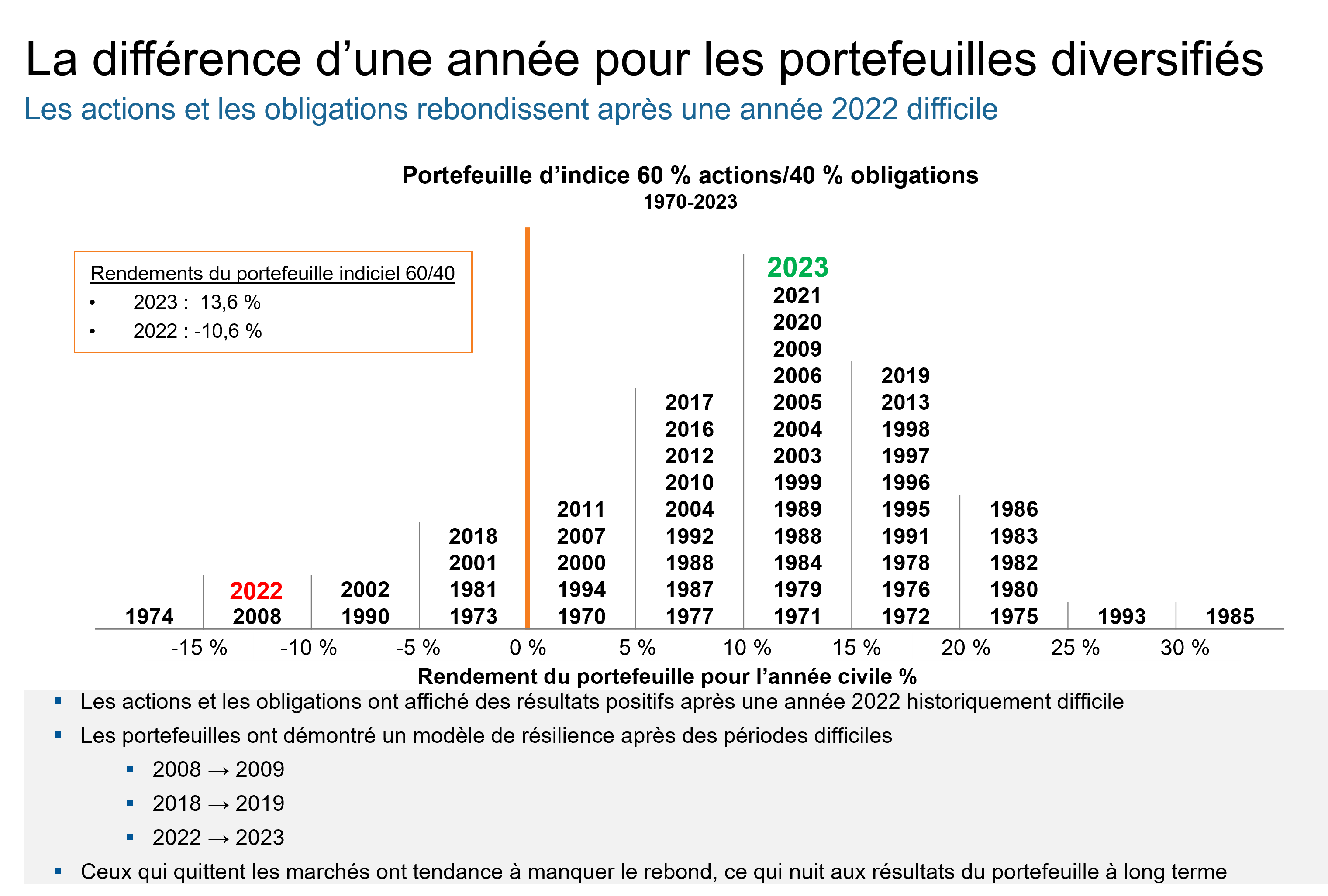 Portefeuille indiciel 60/40 : 20 % d’actions canadiennes, 40 % d’actions mondiales et 40 % d’obligations canadiennes. Actions canadiennes : Indice composé S&P/TSX; actions mondiales : Indice MSCI Monde (1970-1980), Indice MSCI Monde hors Canada (1981-2023); obligations canadiennes : Indice obligataire à long terme FTSE Canada (1970-1979), Indice obligataire universel FTSE Canada (1980-2023). Les rendements des indices sont des rendements passés, qui ne sont pas garants des rendements futurs, et qui ne sont pas représentatifs d’un placement précis. Les indices ne sont pas gérés et il est impossible d’investir directement dans ces derniers.