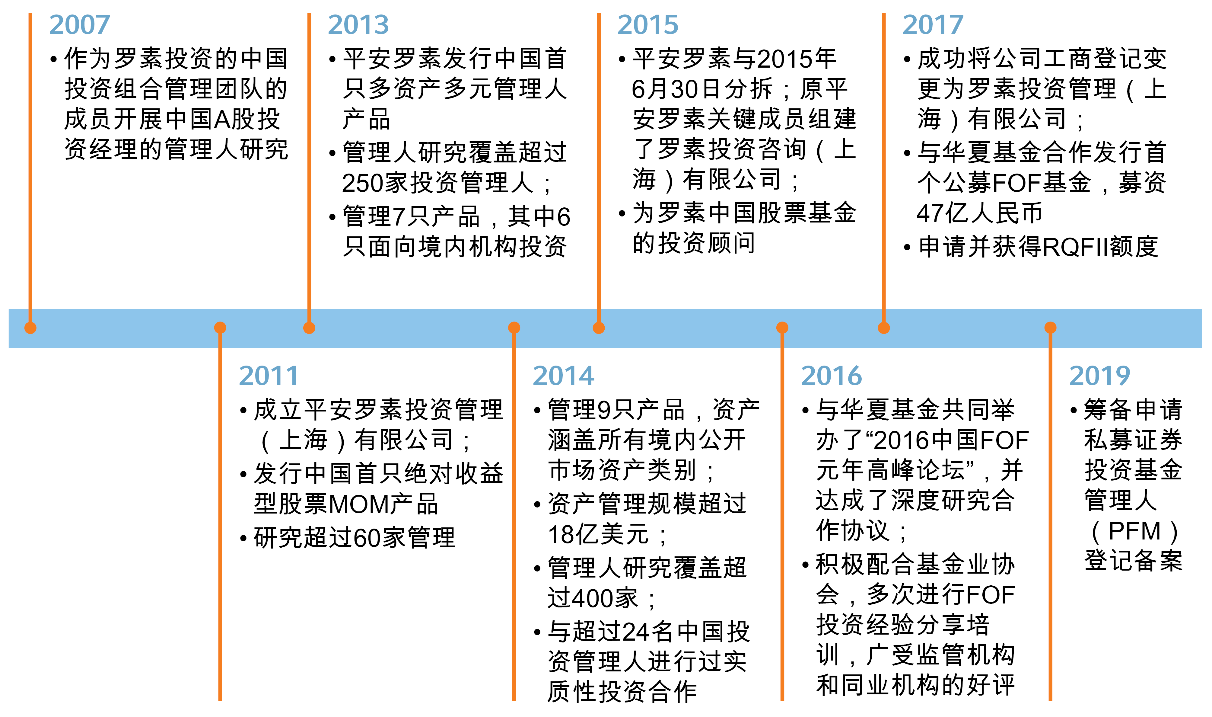 罗素投资早在2007年就开展了针对中国A股投资管理人的研究,并于2011年与平安集团共同成立了平安罗素投资管理(上海)有限公司,发行了其中国首支绝对收益型股票MOM产品。2013年,平安罗素发行了其中国首支多元资产多管理人产品。至2014年,共管理9支产品,资产涵盖所有境内公开市场资产类别,管理规模超过18亿美元,研究覆盖超过400家管理人。2015年罗素投资成立了外商独资企业进一步开拓中国市场,由原平安罗素关键成员组成,为罗素投资中国股票基金Russell Investments China Equity Fund担任投顾工作,并与华夏基金达成了FOF/MOM业务的深度战略合作,于2017年合作发行了其国内首个公募FOF基金,募资47亿人民币。2020年2月,罗素投资管理(上海)有限公司成功完成外商独资私募证券投资基金管理人登记,并于12月成功发行其首个FOF私募证券投资基金。