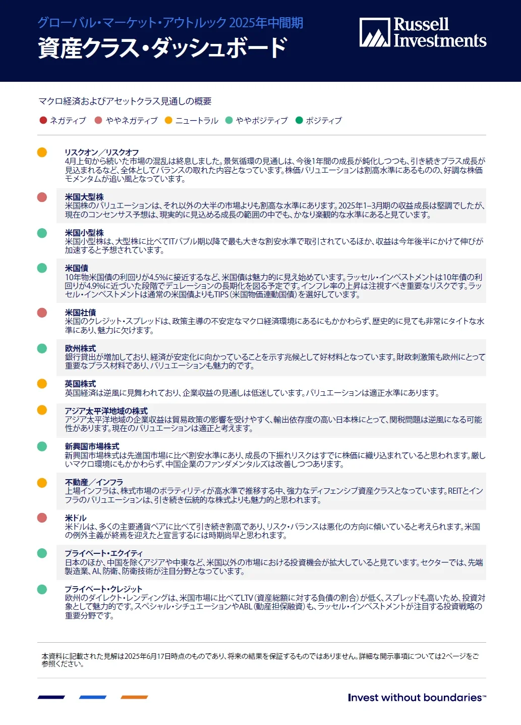 ラッセル・インベストメントは、4月上旬の市場ボラティリティの急上昇は和らいだものの、資産クラスの選好は慎重になっています。ただし、今後については、米ドル安の見通しに基づいて、戦略的にグローバルに分散されたポートフォリオを運用する重要性が増していくと考えています。実際に、我々が採用する運用機関は、上場市場とプライベート市場のいずれについても、米国以外に魅力的な投資機会を見出しています。