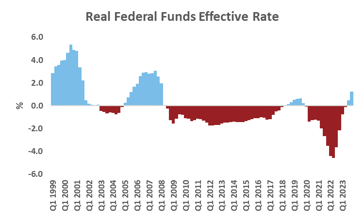 Source: LSEG DataStream, Russell Investments. Real rate based on the difference between the effective Federal Funds target rate and four-quarter average of core-PCE. As of December 2023.