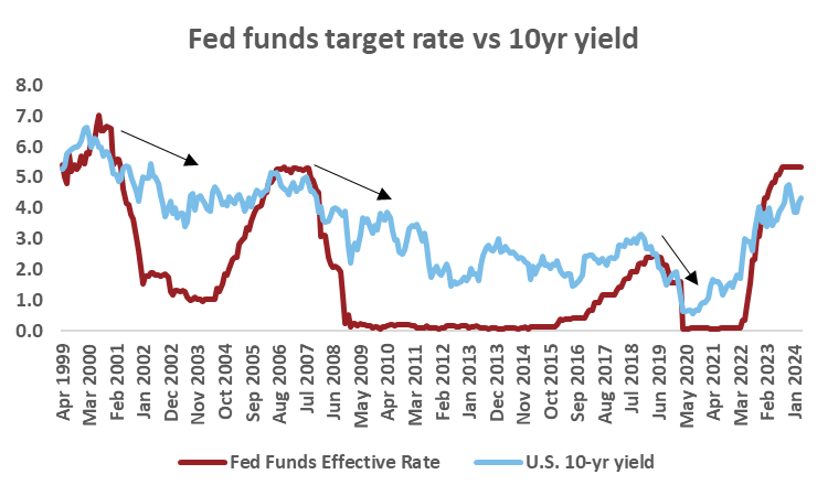 - Despite likely Fed rate cuts this year, U.S. government bond yields have risen on the back of stronger-than-anticipated economic performance.