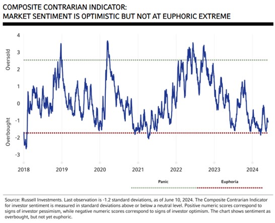 In summary, the business cycle is expected to moderate but not become recessionary, equities are expensive, and market sentiment is leaning toward overbought conditions but not excessively so. Therefore, our process doesn't suggest imminent downside volatility that warrants risk-off positioning. Still, it underscores the need for vigilance and staying close to one's strategic asset allocation. It could be worthwhile for institutional investors to consider how options-based downside management strategies as a type of insurance against an equity market correction might fit in a total portfolio context. Think of it this way: buying home insurance is cheaper when the house isn't on fire. In that sense, the benign volatility environment has lowered the insurance cost.