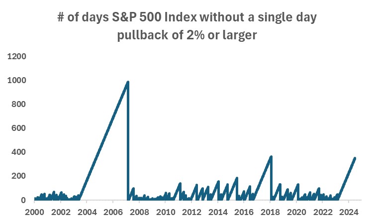 1 Source: https://www.cnbc.com/2024/06/21/stocks-are-in-their-longest-stretch-without-a-2percent-sell-off-since-the-financial-crisis.html