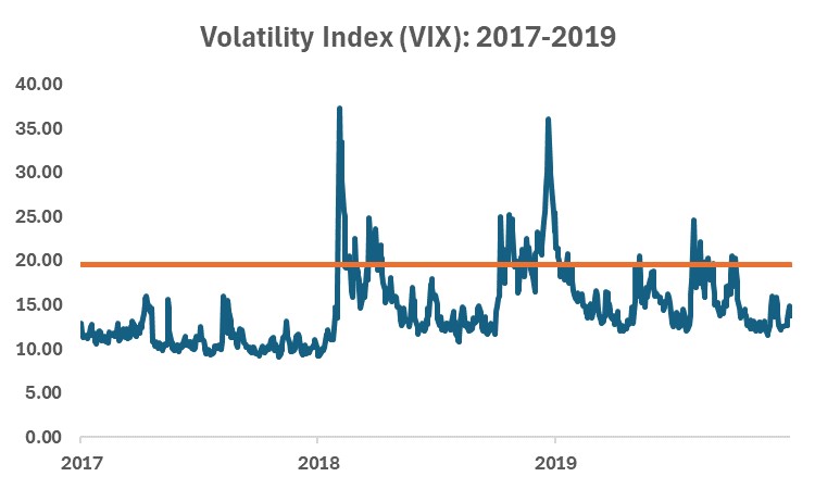 Source: St. Louis Federal Reserve FRED database. Orange line representing the VIX Index long term average is based on the period from January 1990 to June 2024