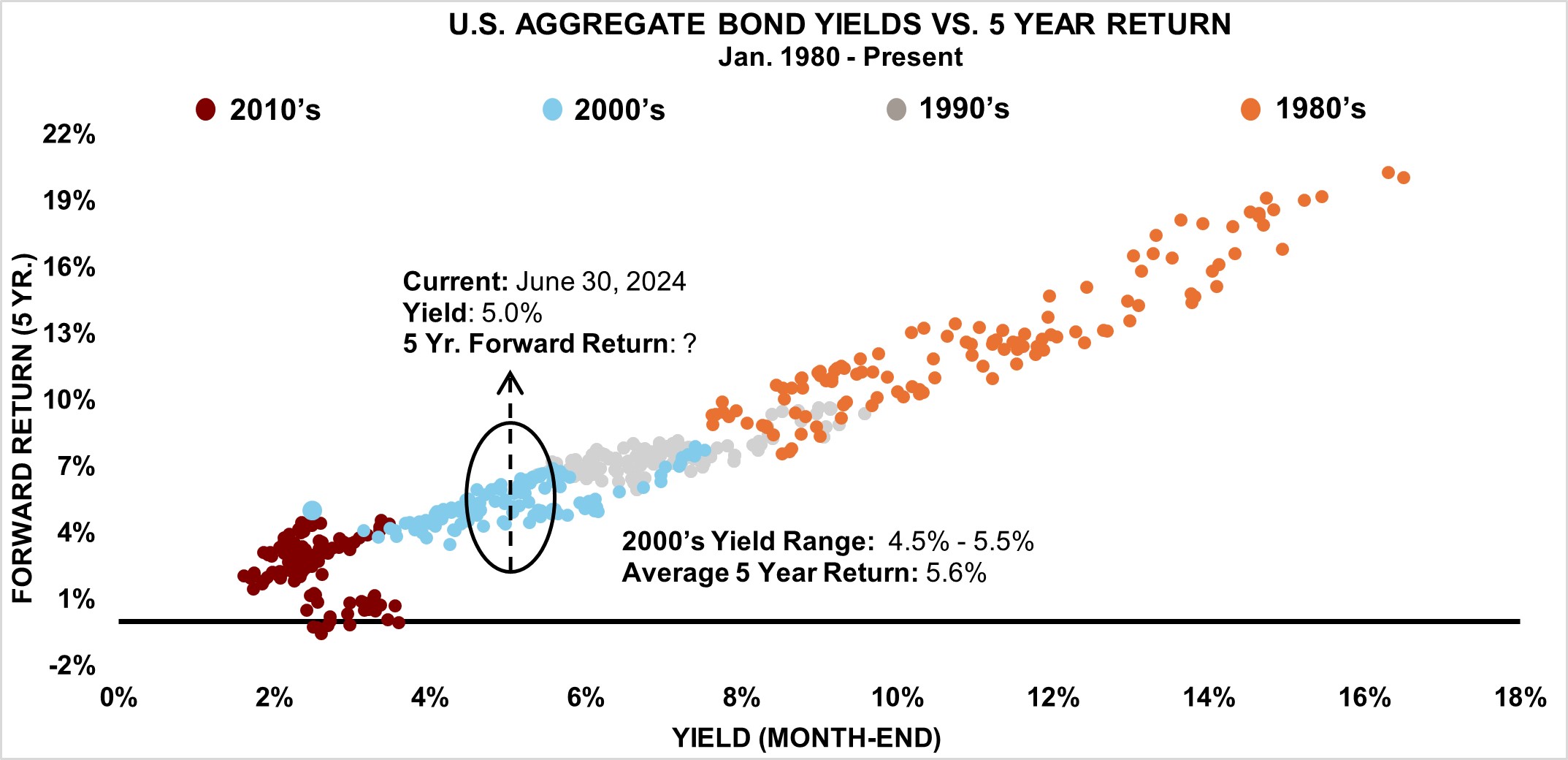 Source: Barclays and Morningstar Direct, as of 6/30/2024. U.S. Bond: Bloomberg U.S. Aggregate Bond Index. Yield: Yield-to-worst; Forward Return: 5-year, annualized, starting in the following month of each yield measure. Index returns represent past performance, are not a guarantee of future performance, and are not indicative of any specific investment.