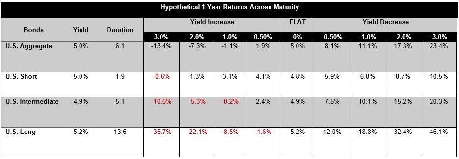 Source: Barclays. Data as of 6/30/2024. U.S. Aggregate: Bloomberg U.S. Aggregate Bond Index, U.S. Short: U.S. Aggregate 1-3 Year Index, U.S. Intermediate: U.S. Aggregate 5-7 Year Index, U.S. Long: U.S. Aggregate 10 Years or Higher Index. Yield: Yield-to-Worst of the Bloomberg U.S. Aggregate Bond Index. Duration: Modified Adjusted Duration. Index returns represent past performance, are not a guarantee of future performance, and are not indicative of any specific investment. Indexes are unmanaged and cannot be invested in directly. https://www.cmegroup.com/markets/interest-rates/cme-fedwatch-tool.html