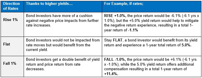 Why? How can today’s bond investors benefit from both declining and rising inflation? The key reason is that with bond yields at 5%, the compensation investors receive to own bonds is much higher regardless of where rates go next. To understand why this is the case, it may be helpful to revisit the fundamental relationship between changes in interest rates and the impact they have on bond prices.