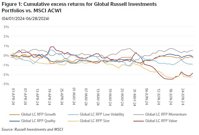 - Among Russell Investments' Factor Portfolios (RFPs), Global Large Cap Momentum outperformed the MSCI ACWI while Global Large Cap Quality and Growth portfolios were relatively flat. Conversely, Global Large Cap Size, Value, and Low Volatility portfolios underperformed.