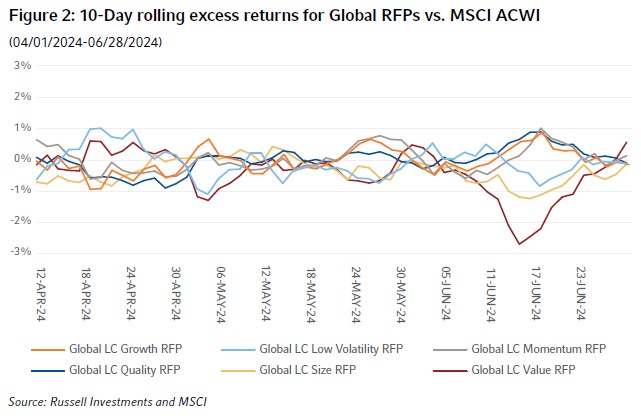 The performance dispersion among Global Russell Factor Portfolios (RFPs) this quarter was quite small for most of the quarter with deviations from the benchmark staying within a range of +/- 1%. Value had a strong period of underperformance at the beginning of June before recovering to recoup some of those losses to finish the quarter.