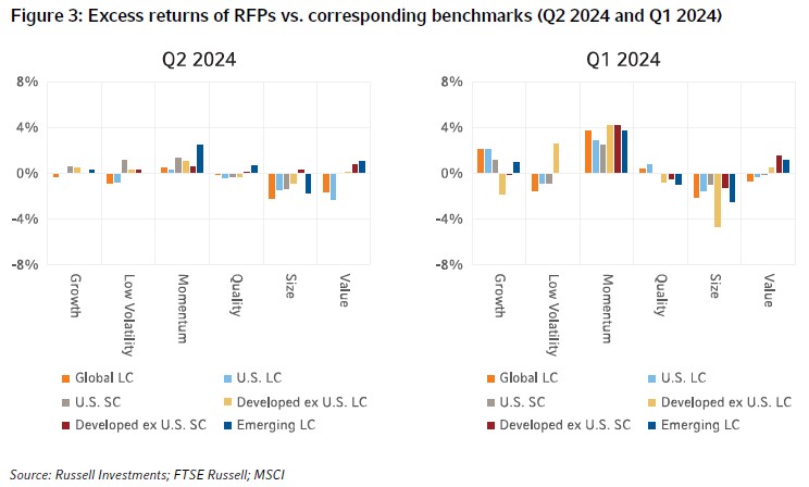 When considering Russell Investments’ global factor portfolios (RFPs), only Global Large Cap Momentum outperformed the benchmark this quarter with positive excess returns of +0.6%. The Global Large Cap Quality and Growth portfolios started the quarter underperforming the benchmark but reversed that trend as the quarter progressed to end the quarter relatively flat with excess returns of -0.1% and -0.2%, respectively. Conversely, the Global Large Cap Size, Value, and Low Volatility portfolios underperformed, with negative excess returns of -2.2%, -1.8%, -0.9%.