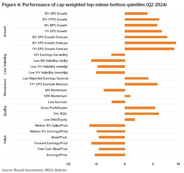 - In the MSCI ACWI universe, all Growth subfactors outperformed in Q2 while all Value and Low Volatility subfactors underperformed.