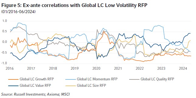 - Correlation between the Global LC Value and Low Volatility RFPs continues to increase, while the correlation between Global LC Momentum and Low Volatility RFPs firmly shifted from being strongly correlated in 2023 to uncorrelated.