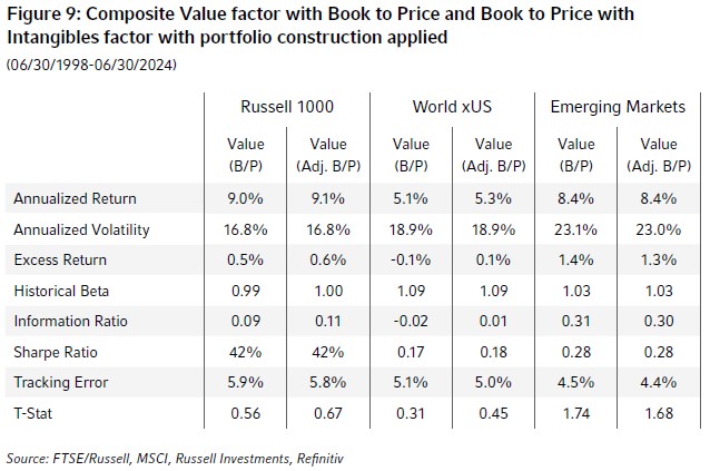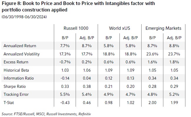 When evaluating the adjustment to book value when applied to a composite factor, the observed premium using single factor portfolio construction is further diluted to a smaller amount. Within the Russell 1000 value factor, the 95-basis-point improvement from the single factor definition is reduced to only 11 basis points. Interestingly, within World ex-U.S., this excess return increases when using adjusted book to price compared to the single factor. In Emerging Markets, the excess return drops to a small 5-basis-point improvement when including intangible assets vs. the traditional measure of book to price.