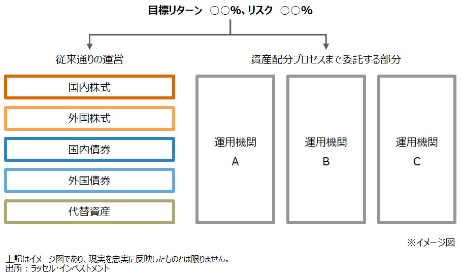 新しいアイデアは、委託者が唯一政策資産配分を決めるのではなく、従来通りの運営に並行して資産配分を含めた広範囲のプロセスを運用機関に委託する運用を組み合わせるというものだ。図で表すと、以下のようになる。