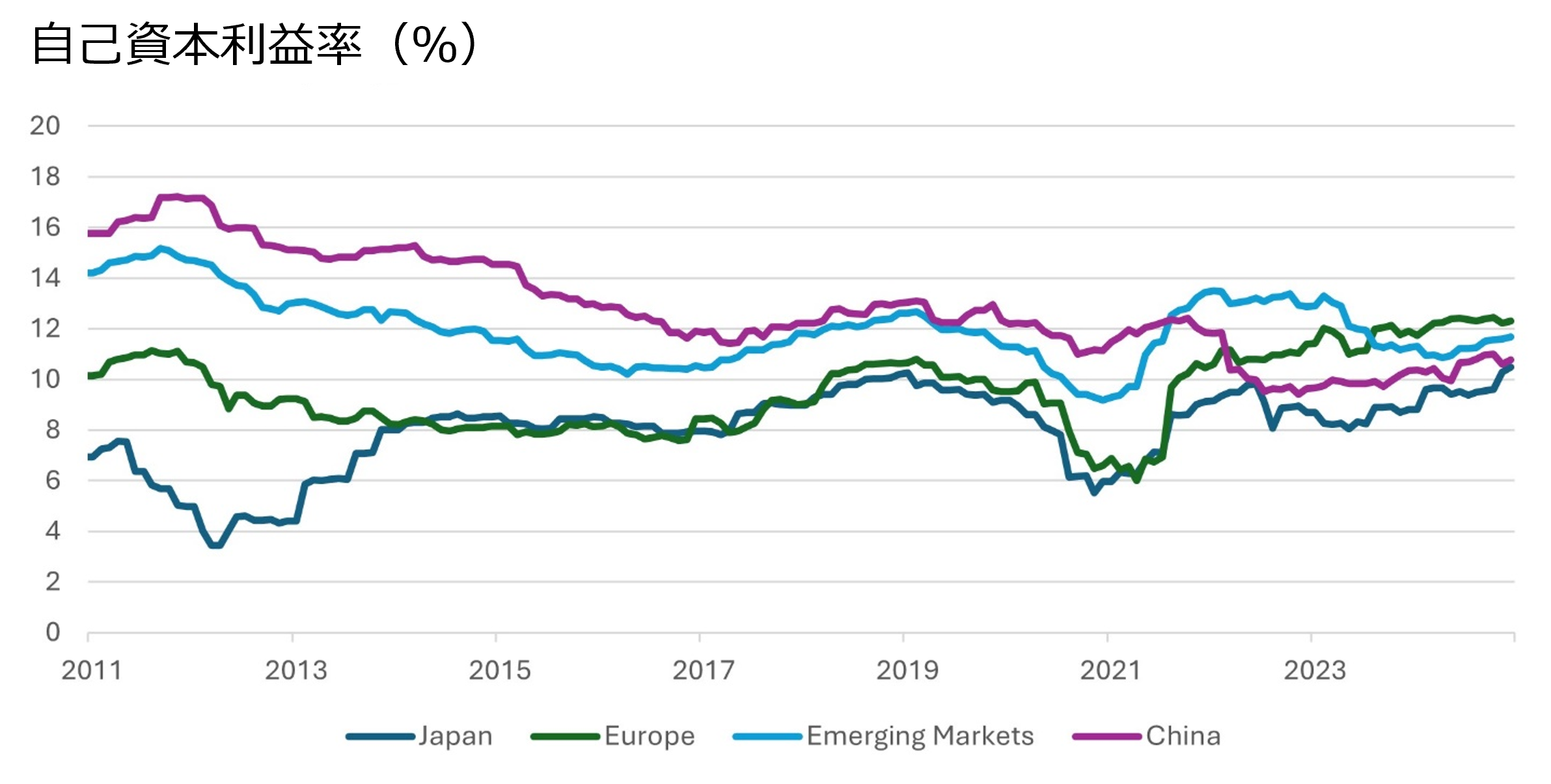 まず景気サイクルについては、景気見通しがやや不透明であるものの、中国企業の自己資本利益率は改善が続いています(下図参照)。EPS(一株当たり利益)は2025年を通じて9%ほど成長するとアナリストは予想しています。4.5%近辺のGDP成長率が達成されるとともに企業の利益率が多少拡大すれば、このEPS予想は達成可能だと思われます。