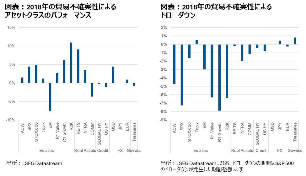 - 2018年から2019年にかけて、米国が他国からの鉄鋼・アルミニウム製品に対して関税を課し、さらに中国製品に対して幅広い関税を導入した際、REIT(不動産投資信託)およびインフラ関連資産クラスが最も好調なパフォーマンスを示しました。