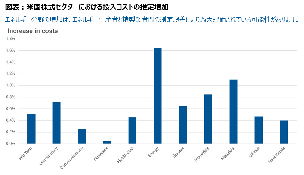 結果は以下のチャートに示されています。米国の各セクターの投入コストは平均で約80bps増加し、特にエネルギー、素材、資本財、一般消費財セクターが最も影響を受けます。一方、金融および通信セクターは最も影響が少ないと推定されます。さらに詳しく見ると、特に自動車、電気機器、輸送が最も影響を受けます。