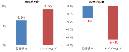 投資家は、投資適格社債に関してはあまりデフォルトを意識しておらず、一方でハイイールド社債についてはデフォルトを意識した投資判断を行っていると説明しました。このため国債利回り部分については、投資適格社債もハイイールド社債もほぼ同じですが、スプレッド部分については、相対的に投資適格社債が低くハイイールド社債が高い傾向があります。加えてハイイールド社債の方が、相対的に利回り変動に占めるスプレッド変動の割合が大きい傾向があります。これはハイイールド社債の方が、より信用リスクが高く、株価との連動性(株価感応度)も高いことを意味しています。