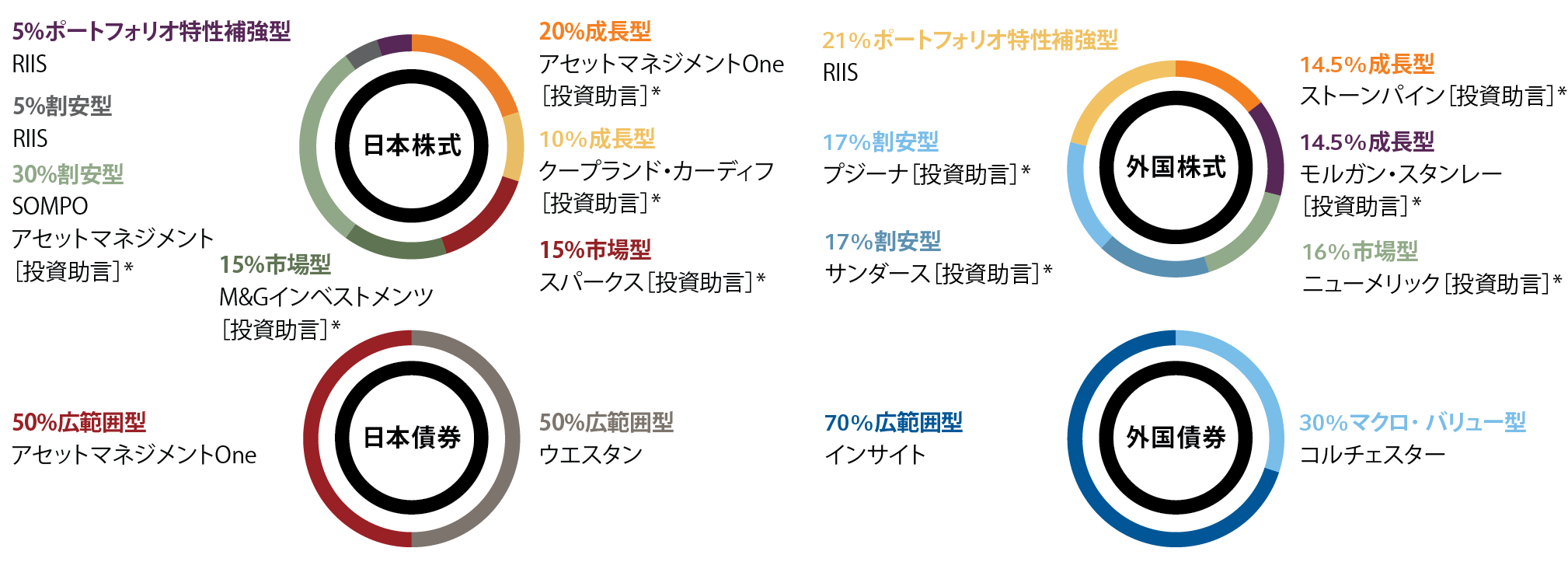 *各運用会社の投資助言に基づき、「ラッセル・インベストメント・インプリメンテーション・サービシーズ・エル・エル・シー」(RIIS)が運用の指図を行います。上記は、ファミリーファンド方式により運用する各ファンドが主要投資対象とする「ラッセル・インベストメント日本株式マザーファンド」、「ラッセル・インベストメント外国株式マザーファンド」、「ラッセル・インベストメント日本債券マザーファンド」、「ラッセル・インベストメント外国債券マザーファンド」(以下「マザーファンド」といいます。)に関するものです。運用会社や目標配分割合の変更は、原則として事前の告知なく随時行います。