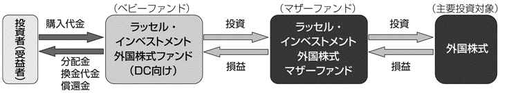 当ファンドはファミリーファンド方式で運用します。ファミリーファンド方式とは、投資者(受益者)から投資された資金をまとめてベビーファンド(当ファンド)とし、その資金を「ラッセル・インベストメント外国株式マザーファンド」(以下「マザーファンド」といいます。)に投資して、実質的な運用をマザーファンドにて行う仕組みです。