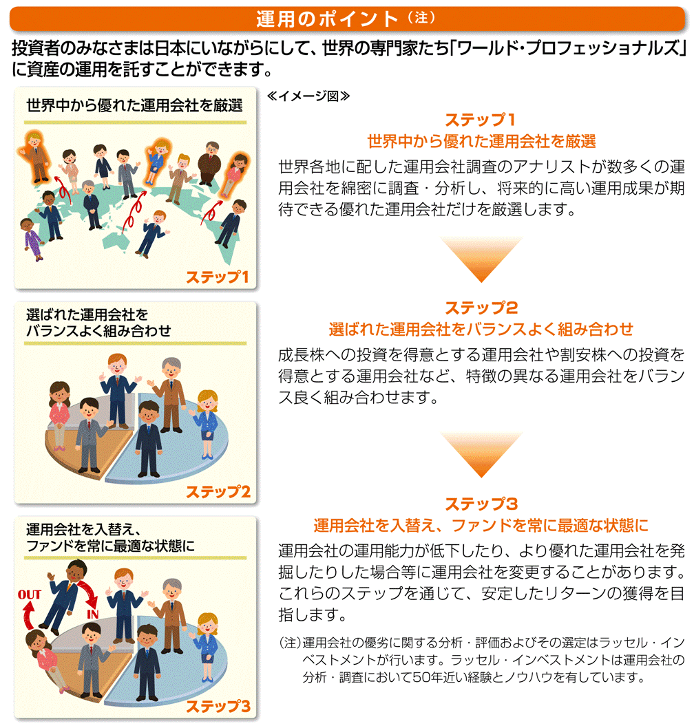 - ラッセル・インベストメントが複数の優れた運用会社を厳選し、それらをバランスよく組み合わせるとともに、必要に応じて入替え等を行います。