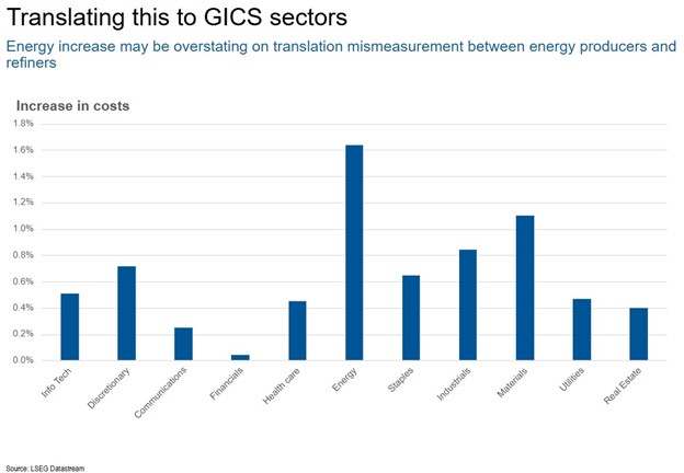 그 결과 아래와 같은 차트가 도출되었으며, 이에 따르면 미국 주식 부문 전반에 걸쳐 투입 비용 증가가 전망됩니다. 미국 내 섹터의 전체 평균 상승률은 약 80bp이며, 에너지, 소재, 산업재, 임의소비재가 가장 큰 영향을 받는 것으로 나타났습니다.반대로 금융과 통신 섹터는 가장 영향을 적게 받을 것으로 추정됩니다.좀 더 세부적으로 들여다보면 자동차, 전기 장비, 운송 부문의 타격이 가장 클 것으로 예상됩니다.