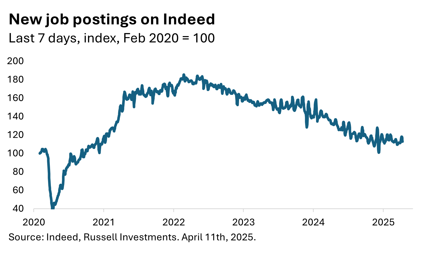 Are businesses cutting back on hiring? Not yet. Indeed—a leading platform for online job postings—shows no decline in its daily data for new listings through April 11 (chart).