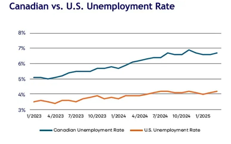 Canada's economy is struggling to stay afloat. The Canadian unemployment rate has risen at a much sharper pace compared to the U.S. unemployment rate, and trade policy uncertainty threatens to make things even more challenging.